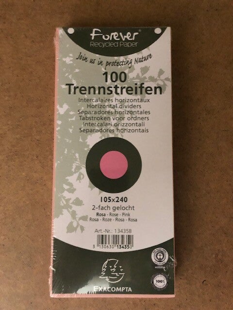 FOREVER® Pak van 100 horizontale tabstroken/scheidingsstroken met perforatie 180g - 105x240mm De horizontale tabkaarten laten een organisatie toe van een ringmap of een hefboomordner door zoveel scheidingen als gewenst toe te voegen. Mogelijkheid om een code aan te maken door kaarten van verschillende kleuren te gebruiken. Blauwe Engel gecertificeerd, de garantie voor een kwalitatief gerecycleerd product met respect voor het milieu.